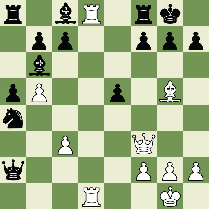 [FEN "r1bR1rk1/1pp2ppp/1b6/pP2p1B1/n1q5/2P2Q2/N4PPP/3R2K1 b - - 1 20"]