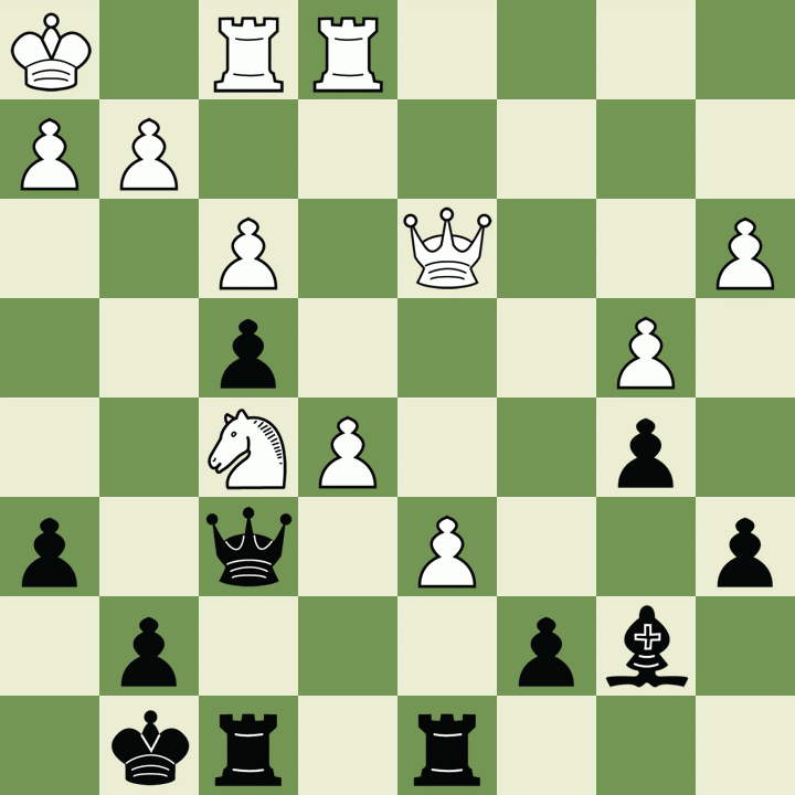 Qxb4 31. Rxb4 Rxa2 32. Rg4 Kg7 −+) ({-9.39} 28. Qg5 Qxc3 29. Qe5 Qc7 30. Qxc7