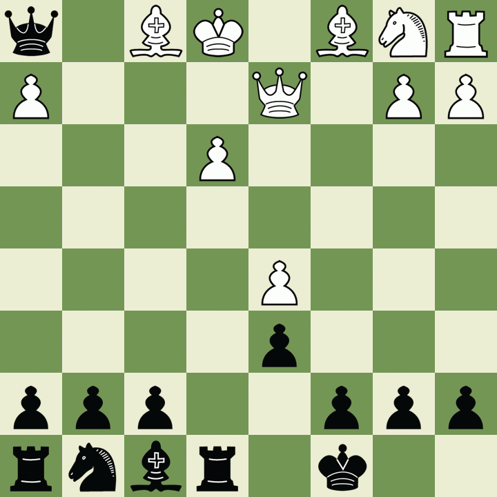 Bf8 3. Bxf8 Qa5+ 4. Qd2 Qa1+ 5. Qd1 Qxd1+ 6. Kxd1 Bb3+ 7. Kd2 Kxf8 8. Kc3 Bd5 9.